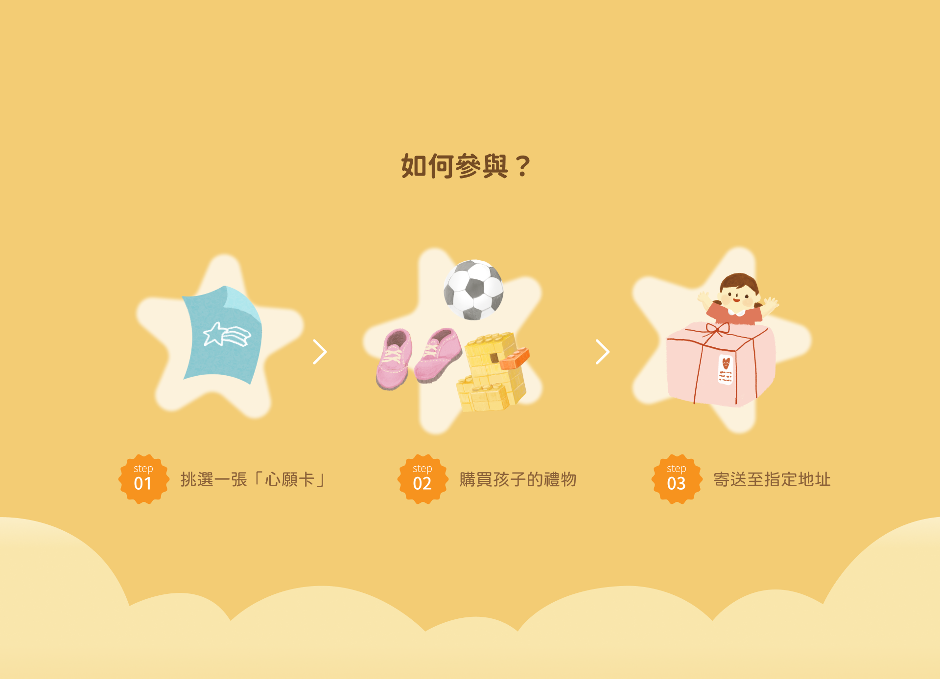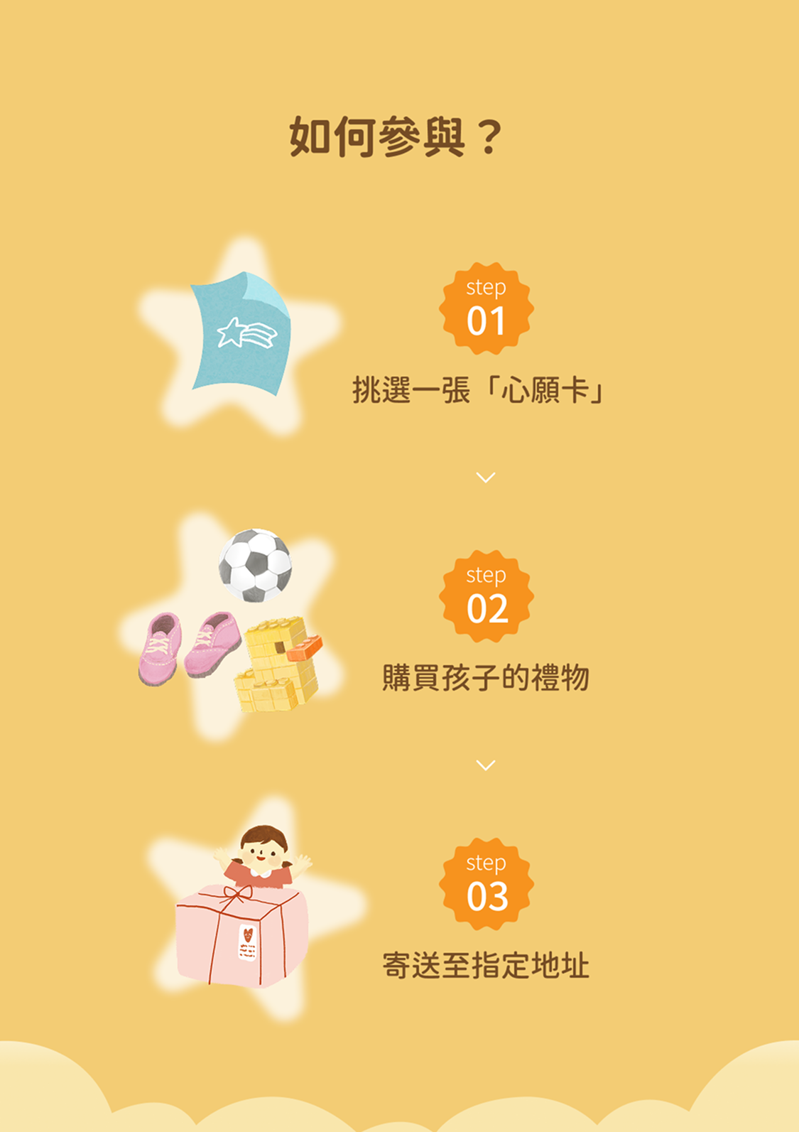 禮物內容須符合須符合小朋友心願小卡的願望,請準備「全新」禮物, 勿贈送二手物唷,感謝大家的配合。